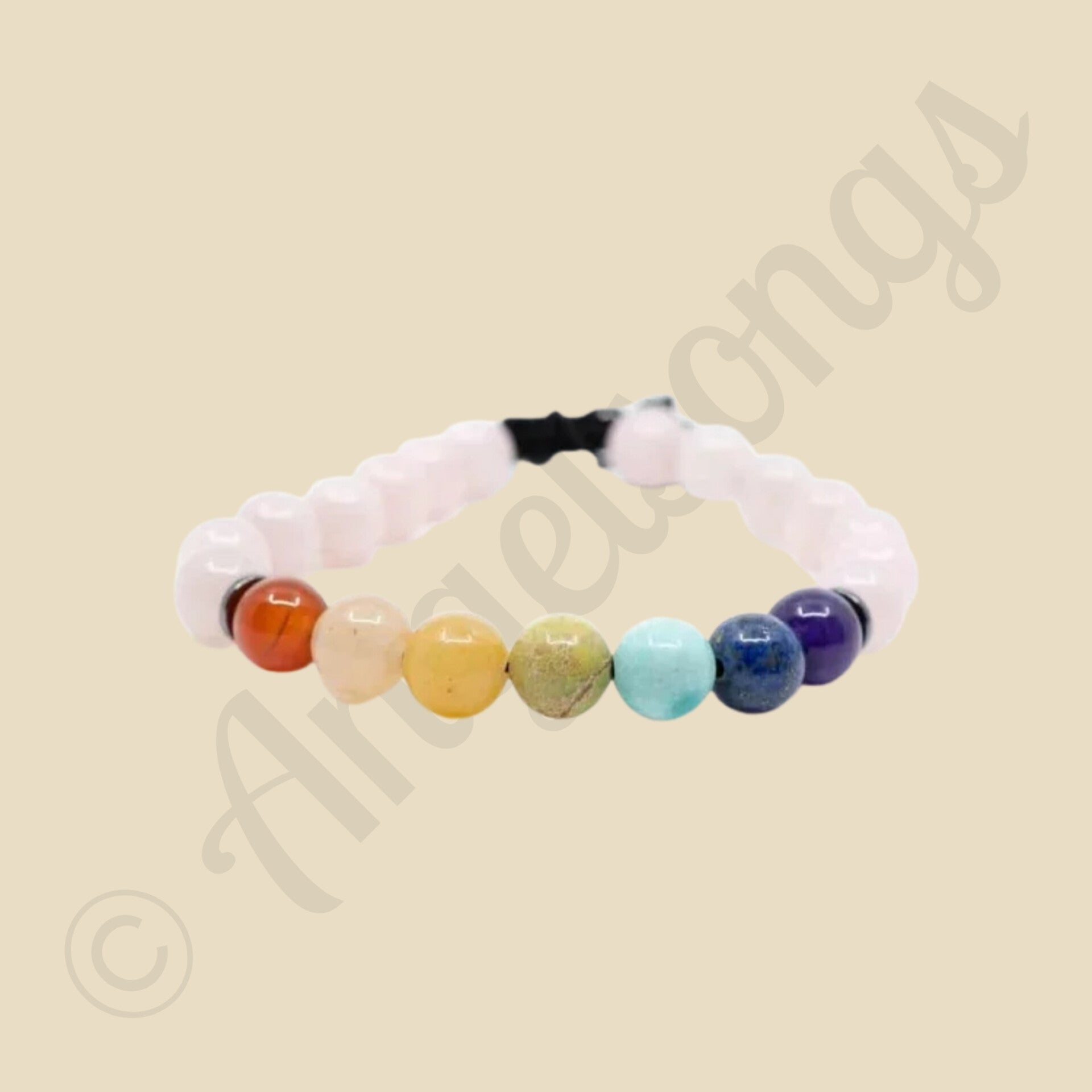 Elastische armband van rozenkwarts, met een steen voor elk van de zeven chakra’s.