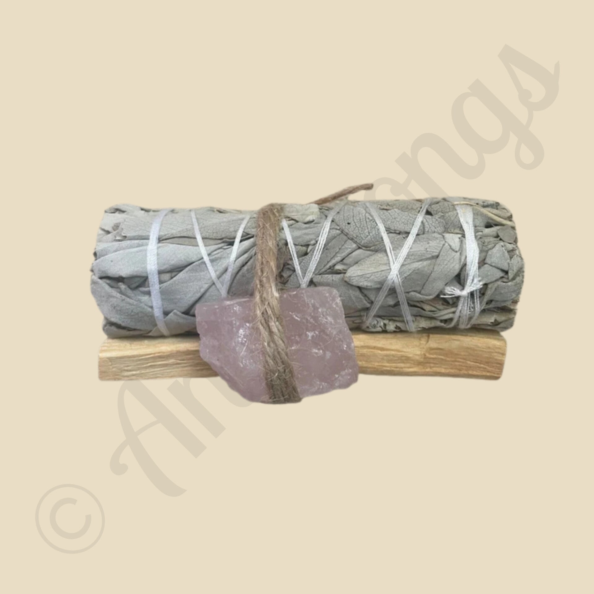 Creëer een krachtige energetische reiniging met deze unieke smudge stick van witte salie, Palo Santo hout én een ruwe edelsteen. Deze spirituele tool combineert het zuiverende vuur van salie, de heilige geur van Palo Santo én de beschermende kracht van edelsteenenergie. Perfect voor wie zijn huis, lichaam of geest wil reinigen én versterken.